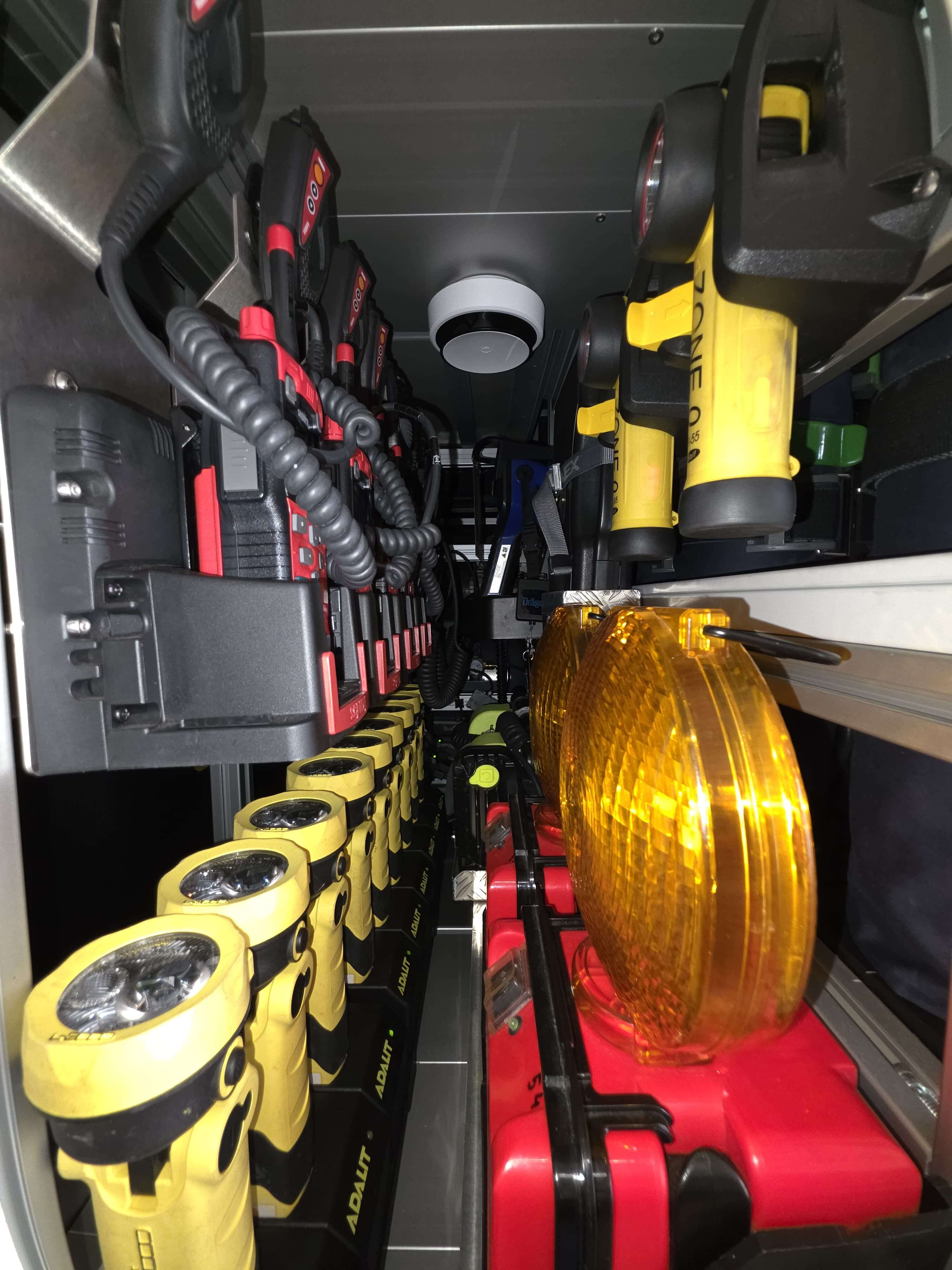 Darunter können Ladeeinrichtungen für Wärmebildkameras, Funkgeräte, Beleuchtungsgeräte, Akkus von Drohnen, Hydraulischem Rettungsgerät sowie Akku-Ladegeräte für Bohrschrauber und andere Werkzeuge zählen.